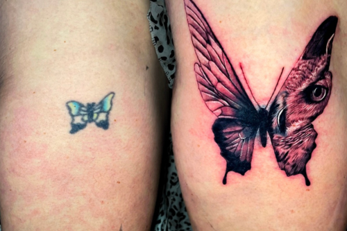 Vlinder met uilengezicht in vleugel en kleine oude vlinder op bovenbeen.