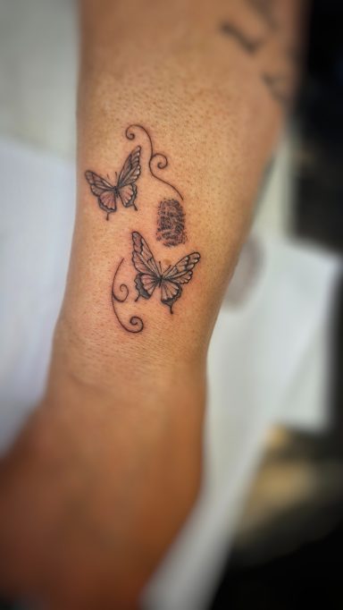 Twee vlinders, een vingerafdruk en sierlijke krullen op een enkel.