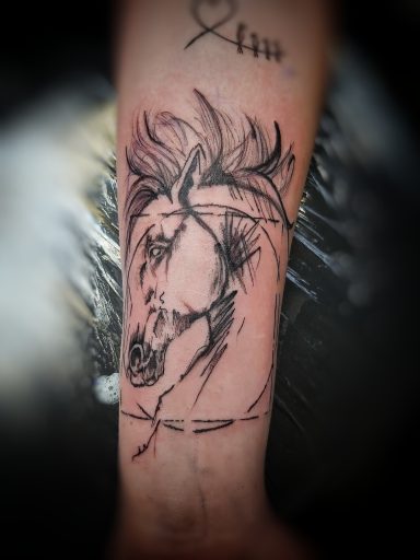 Schetsmatige paardenhoofd tattoo in een kader op de onderarm.
