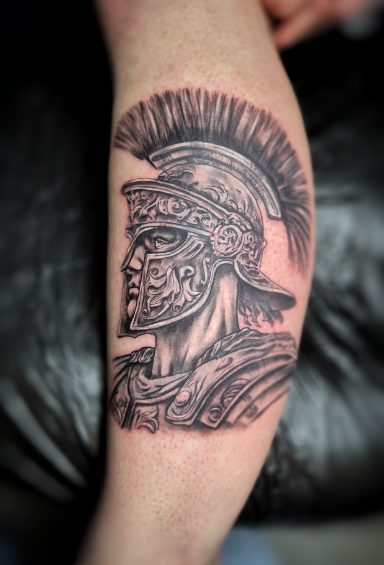 Realistische zwart-wit tattoo van een Romeinse soldaat met helm op onderbeen.