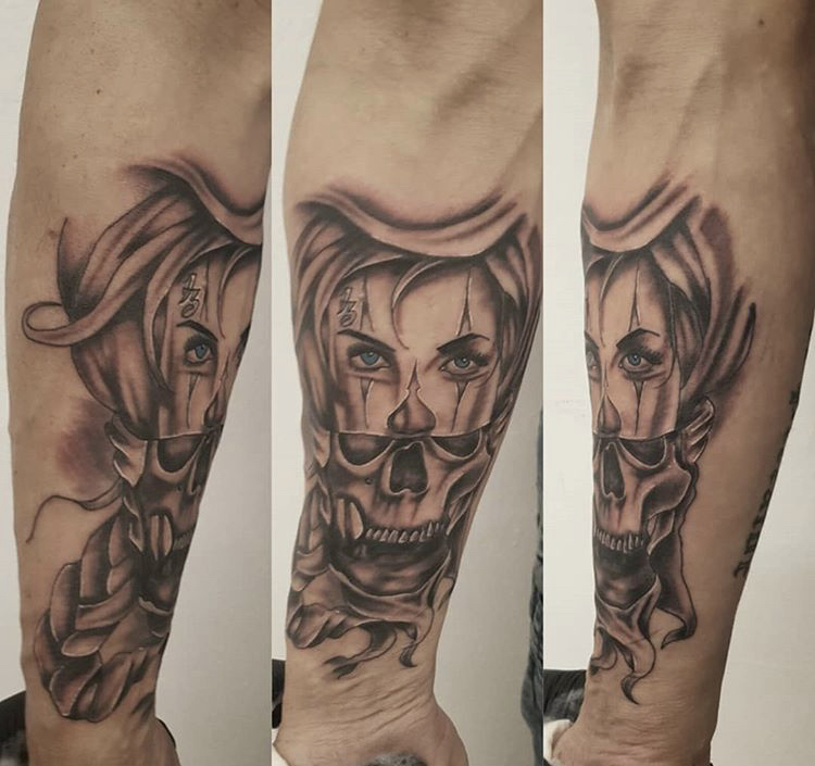 Realistische tattoo van een vrouw met een schedelmasker en blauwe ogen.
