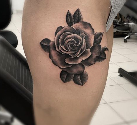 Realistische zwart-grijze roos met bladeren op bovenbeen.