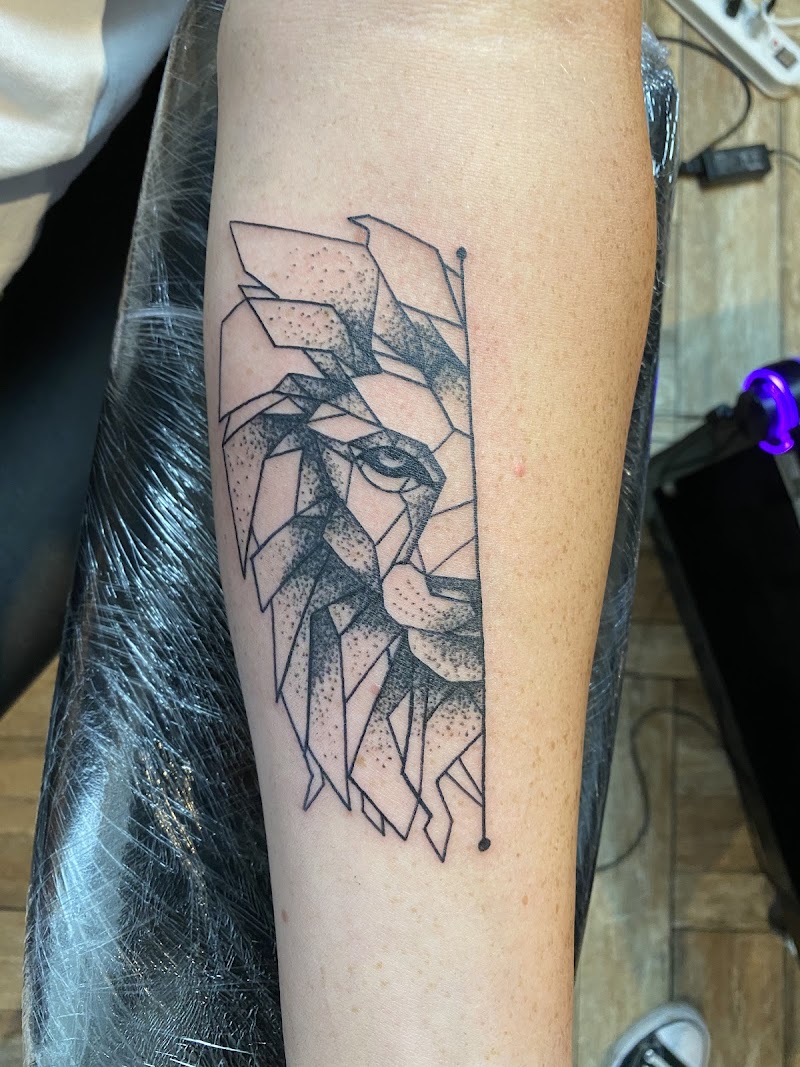 Geometrische leeuw tattoo met dotwork op onderarm.