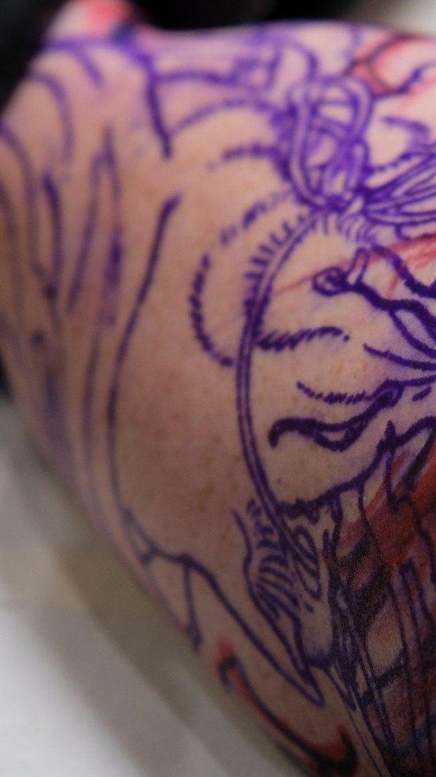 Close-up van een paars tattoo stencil en het begin van een tattoo op een arm.