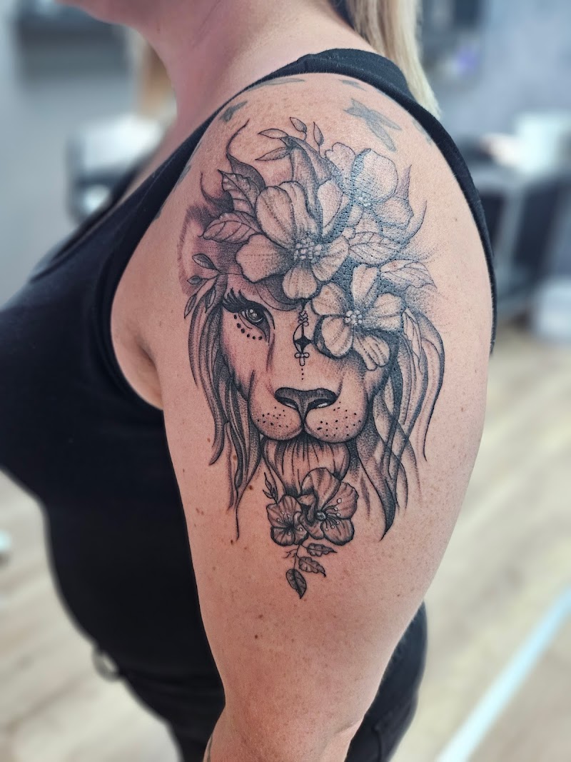 Fineline leeuwenkop met bloemen en sieraad op bovenarm.