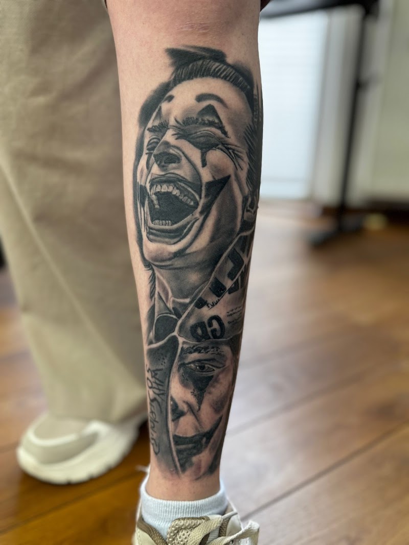 Realistische Joker tattoo op onderbeen, lachend en serieus gezicht.
