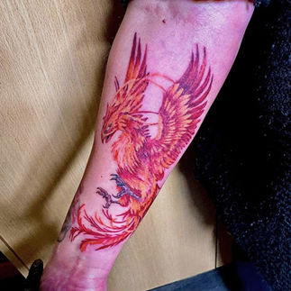 Kleurrijke feniks tattoo in vurige tinten op de onderarm.