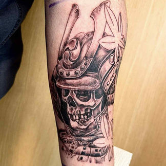 Blackwork tattoo van een samoerai schedel met helm en bladeren.