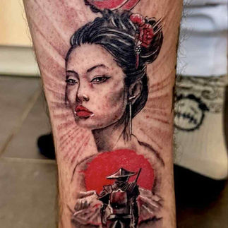 Realistische geisha en samoerai met rode zon op onderbeen.
