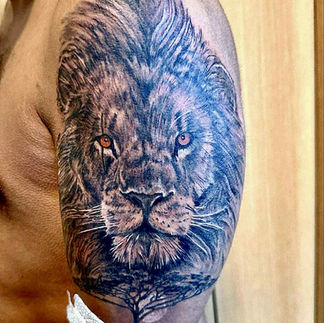 Realistische leeuwenkop met oranje ogen en savanneboom op bovenarm.