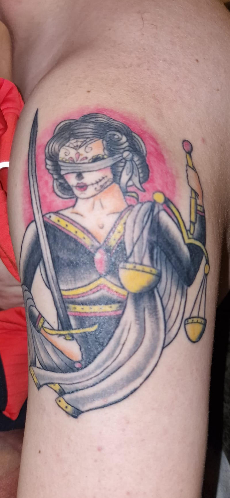 Vrouwe Justitia met suikerschedel masker en blinddoek op bovenarm.