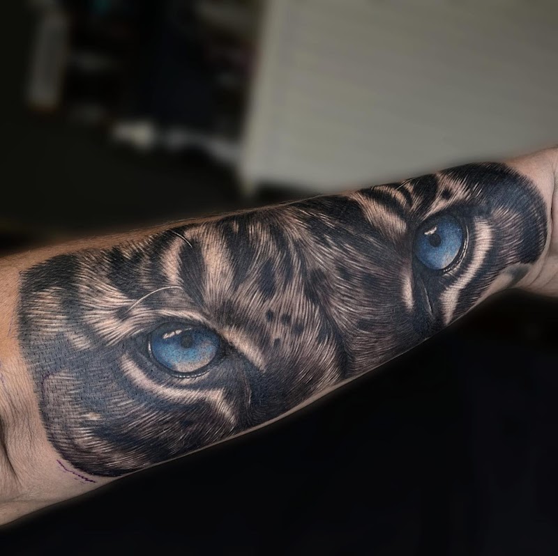 Realistische tijgerogen met blauwe irissen op de onderarm.