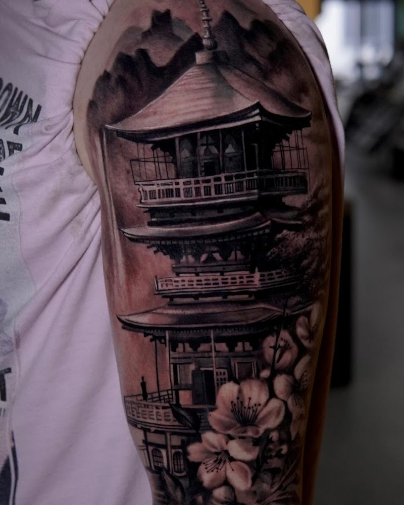 Realistische Japanse pagode met kersenbloesem op bovenarm.