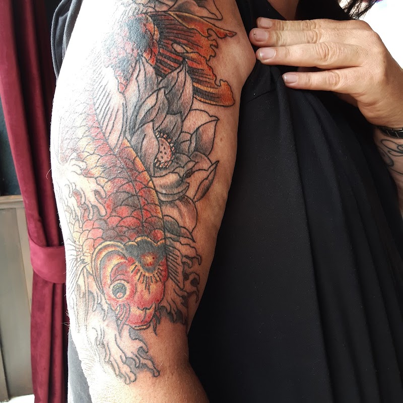 Japanse koi karper en lotusbloem tattoo op de bovenarm.