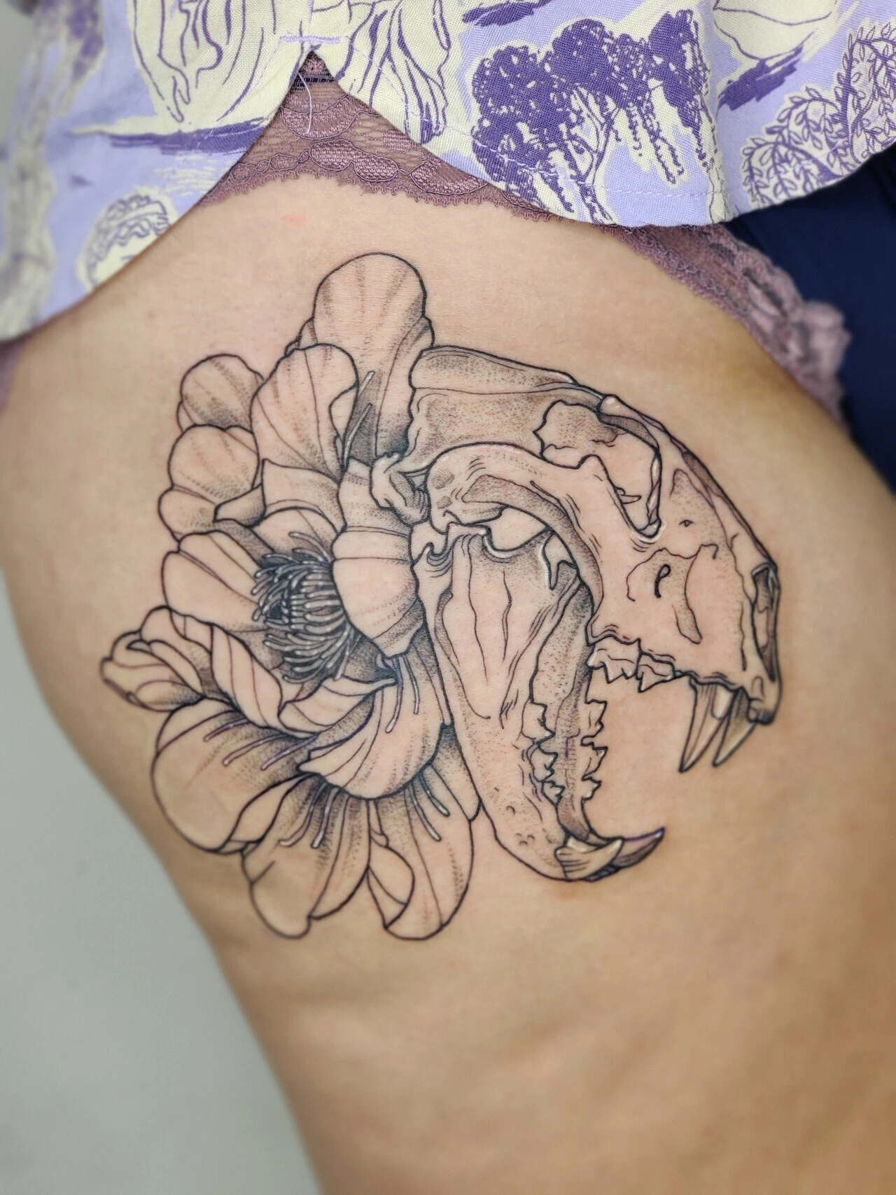 Fineline tattoo van een sabeltandtijger schedel met bloemen op het bovenbeen.