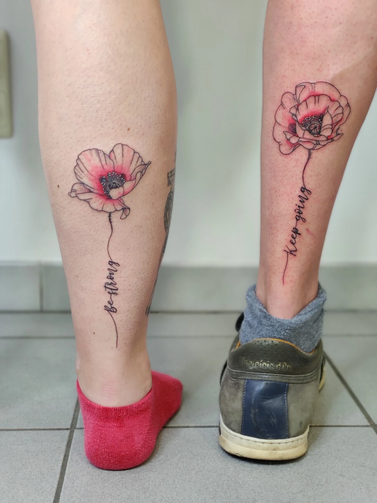 Twee fineline klaprozen met tekst 'be strong' en 'keep going' op enkels.