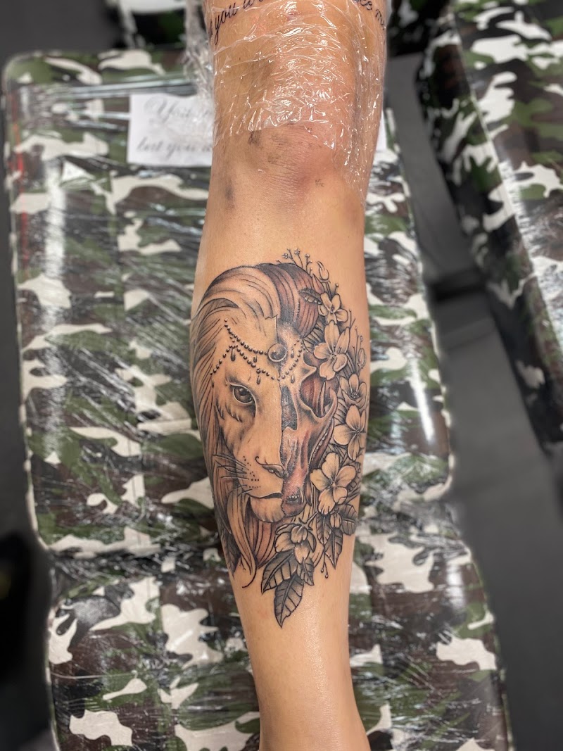 Halve leeuw, halve schedel met bloemen en sieraden op onderbeen.