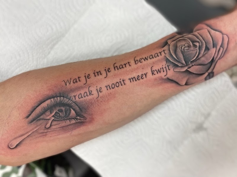 Zwart-wit tattoo van een huilend oog, roos en Nederlandse tekst op de onderarm.