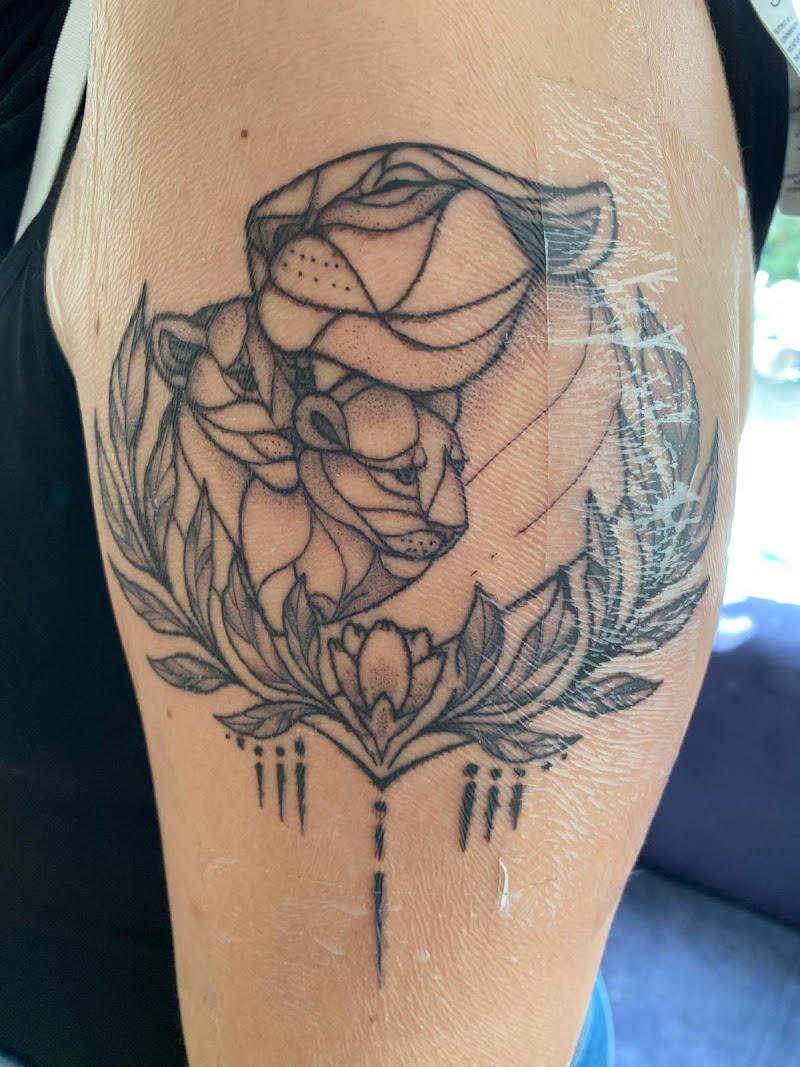 Geometrische leeuwin en welp met bladeren en ornamenten op bovenarm.