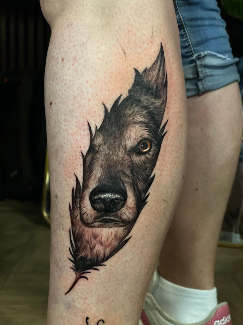 Realistische wolfskop verwerkt in een veer op het onderbeen.