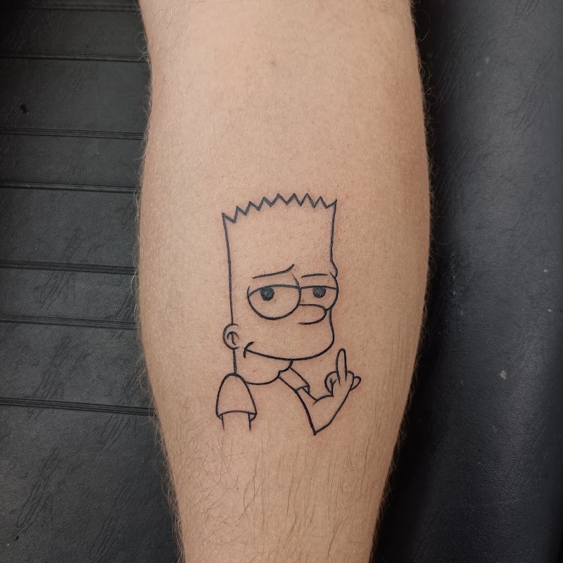 Fineline tattoo van Bart Simpson die zijn middelvinger opsteekt.