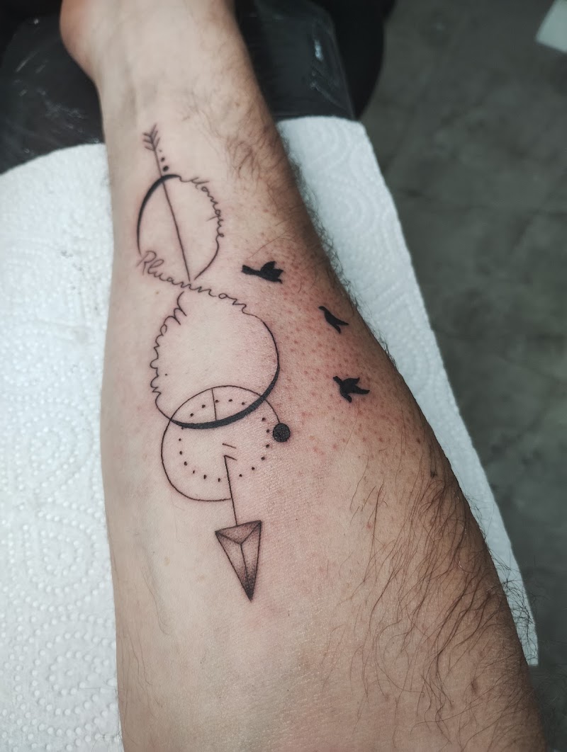 Fineline pijl met namen, oneindigheidsteken en vogels op onderarm.