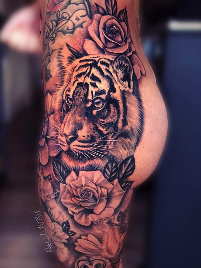 Realistische tijgerkop met rozen op bovenbeen en heup.