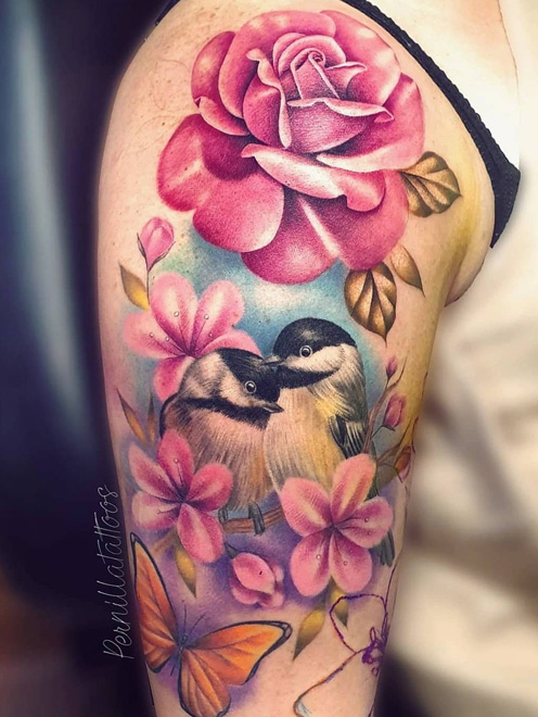 Kleurrijke tattoo van roos, twee vogels en vlinder op bovenbeen.