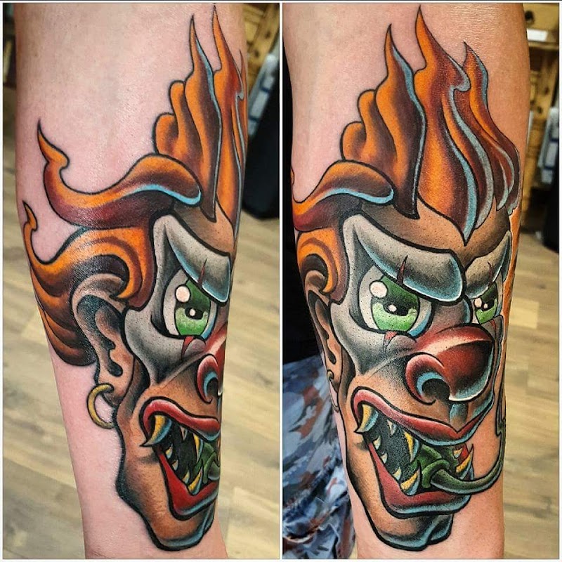 Kleurrijke neo-traditional tattoo van een boze clown met vlammend haar.