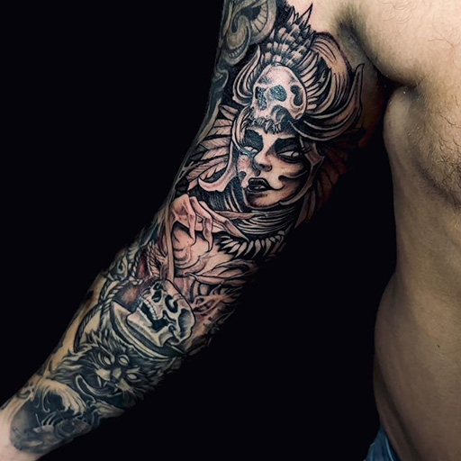 Zwart-wit sleeve met vrouw, schedels en kat.