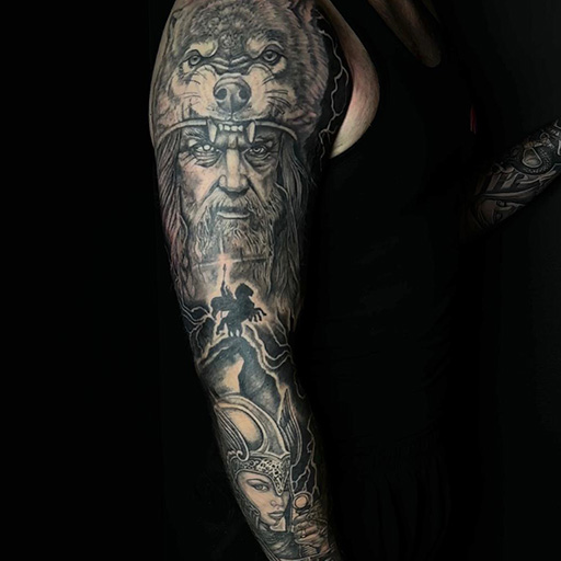 Realistische sleeve met Odin, wolf en valkyrie.