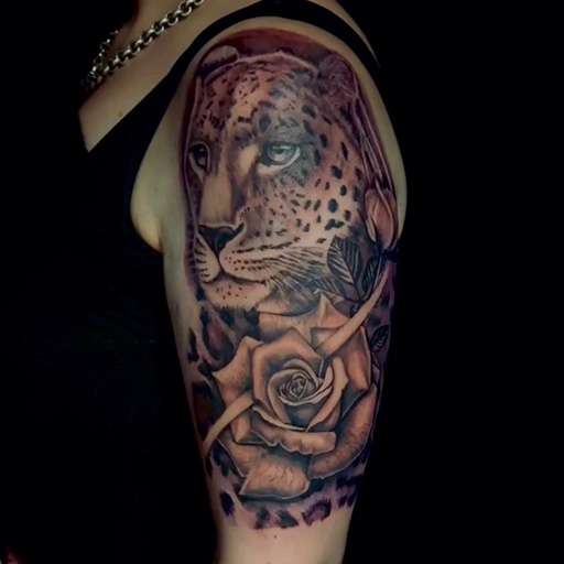 Realistische luipaard en roos op bovenarm.