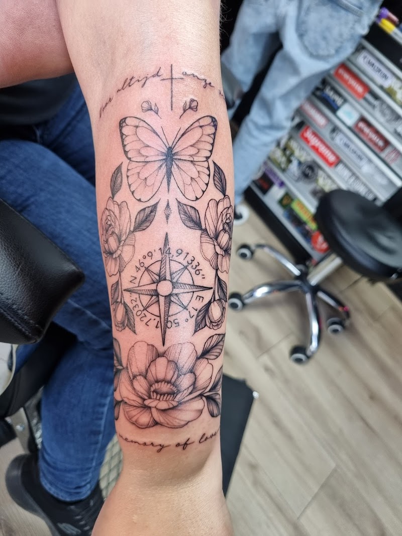 Fineline half-sleeve met vlinder, kompas, bloemen en tekst op onderarm.