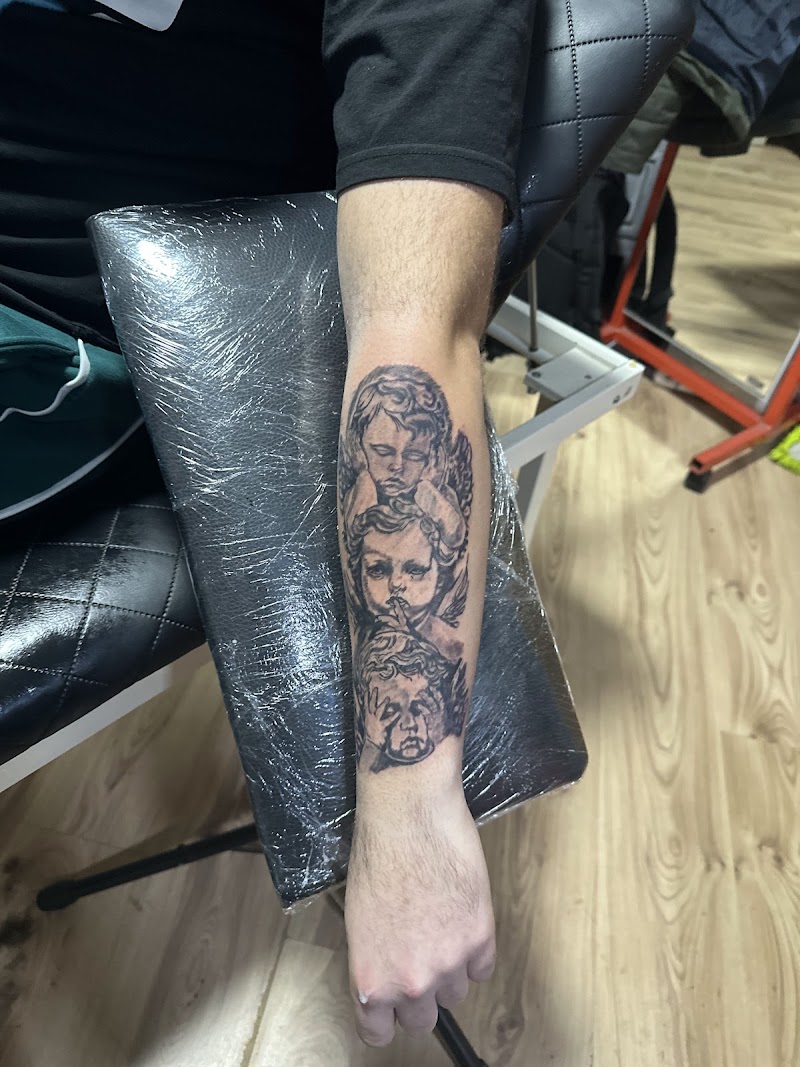 Zwart-wit tattoo van drie cherubijntjes op de onderarm.