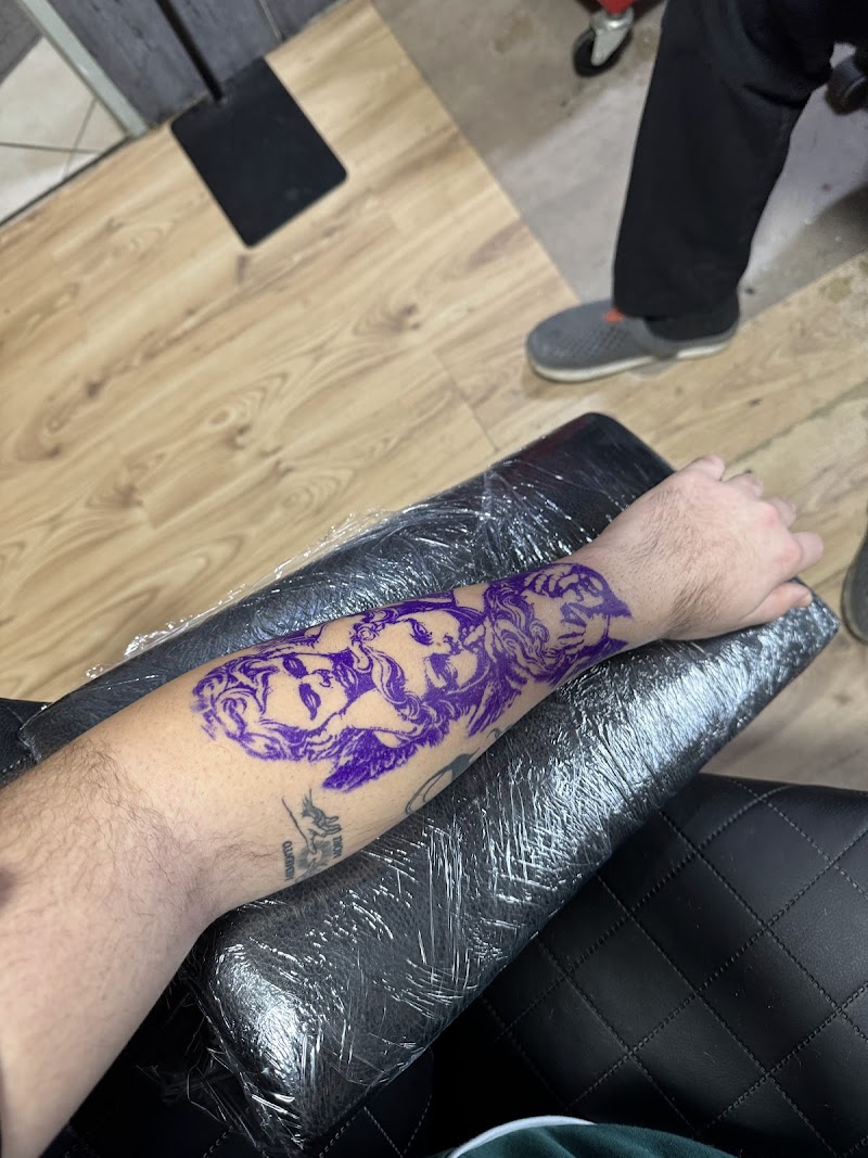 Paarse stencil van religieus tafereel op onderarm.