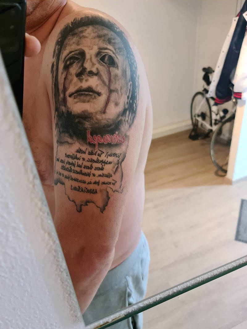 Realistisch portret van Michael Myers met tekst op de bovenarm.