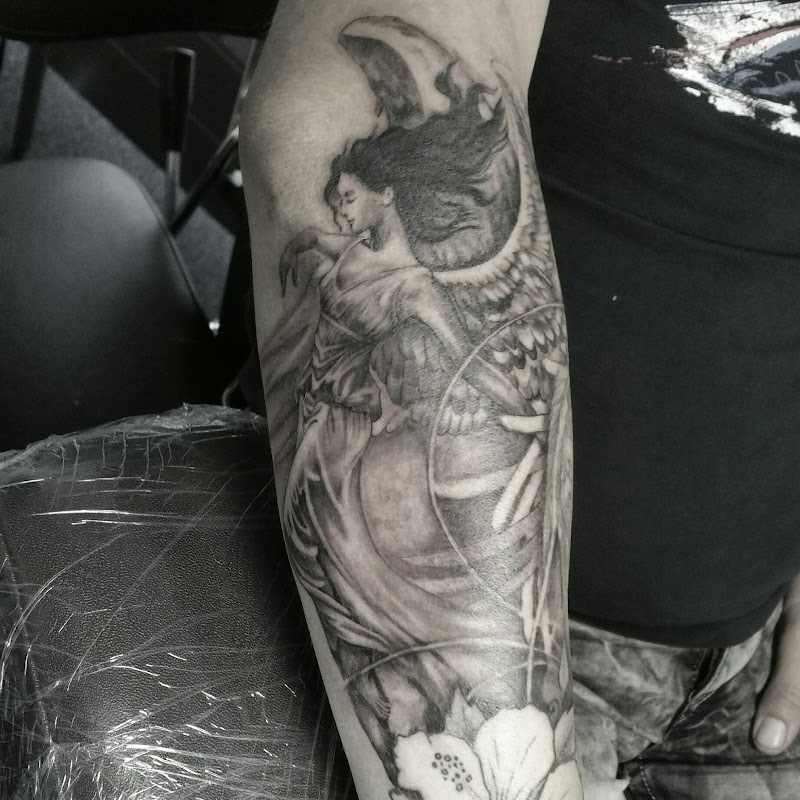 Zwart-wit tattoo van een engel met vleugels op de onderarm.
