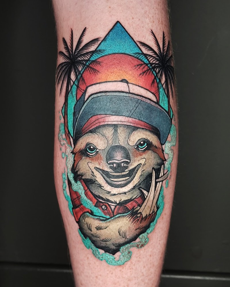 Kleurrijke neo-traditional tattoo van een luiaard met pet en zonnebril.