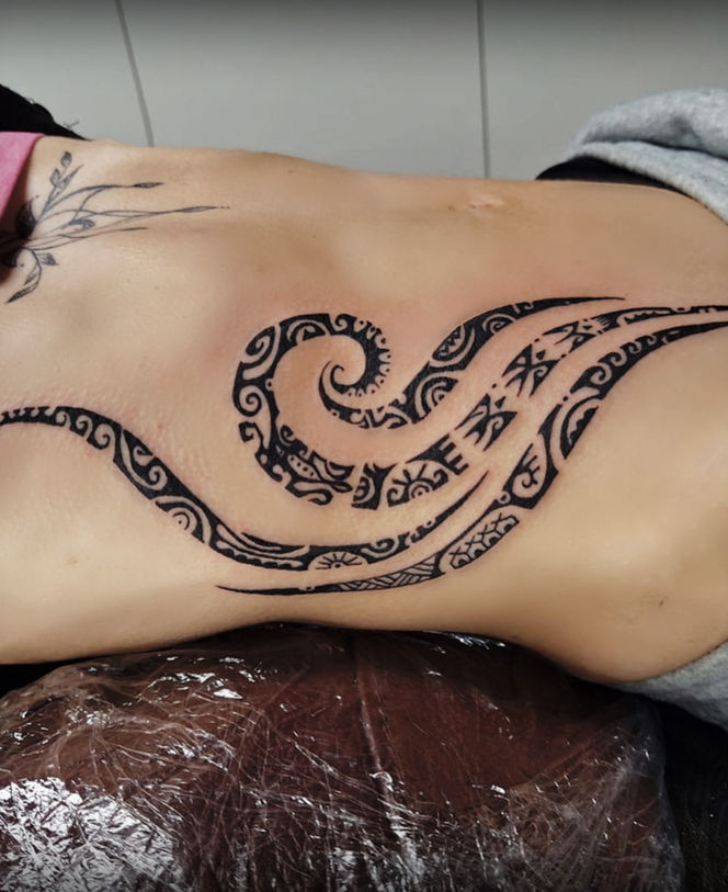 Grote zwarte tribale golf tattoo op de ribben en zij.