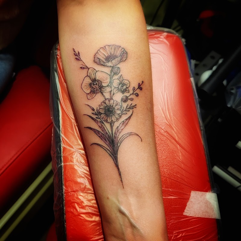 Fineline bloemenboeket met orchidee en klaproos op onderarm.