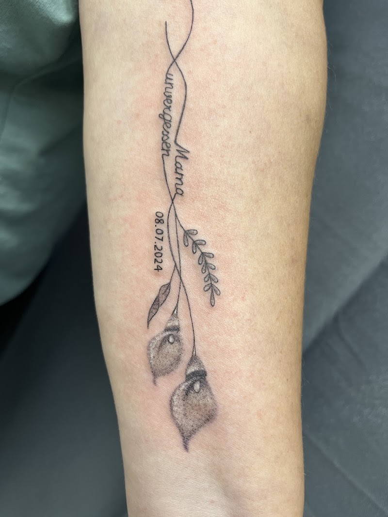Fineline tattoo met calla lelies, tekst 'unvergessen Mama' en datum.