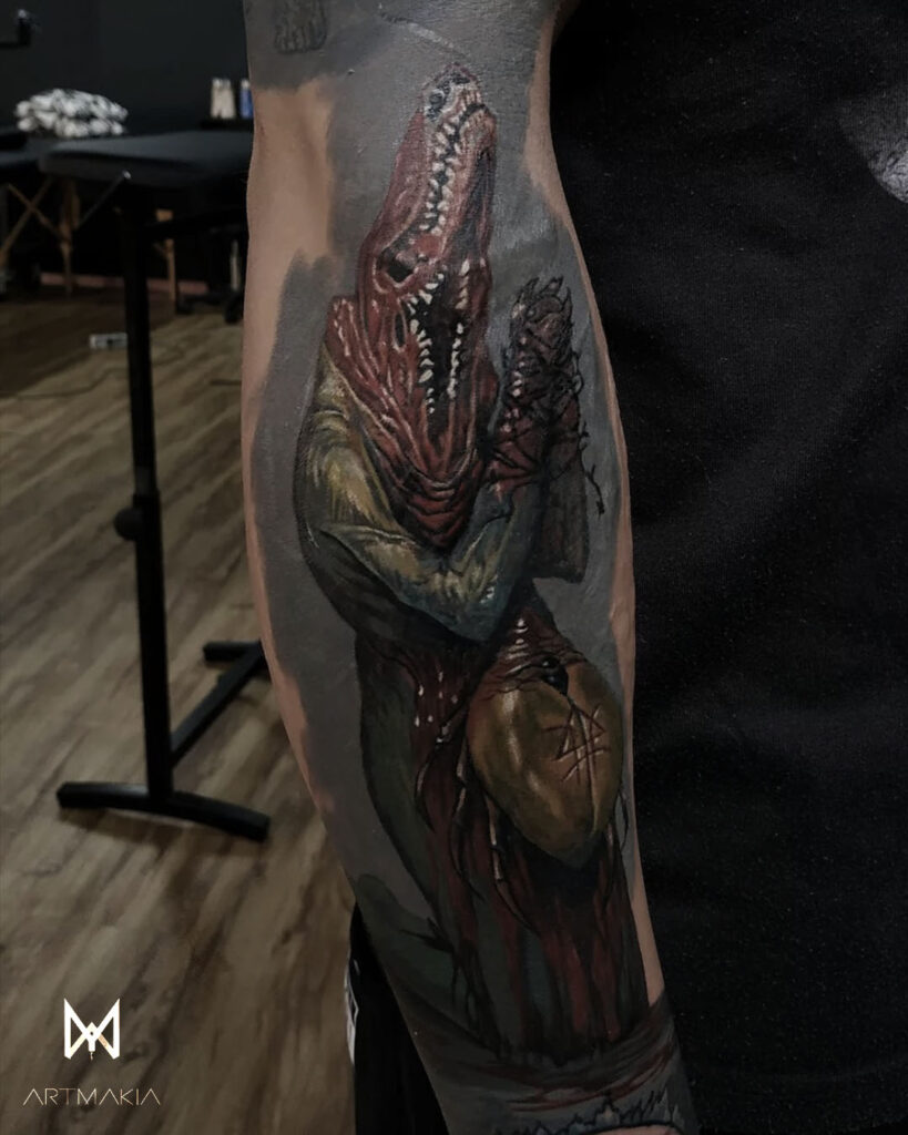 Duistere illustratieve tattoo van een krokodil-achtig wezen op de onderarm.