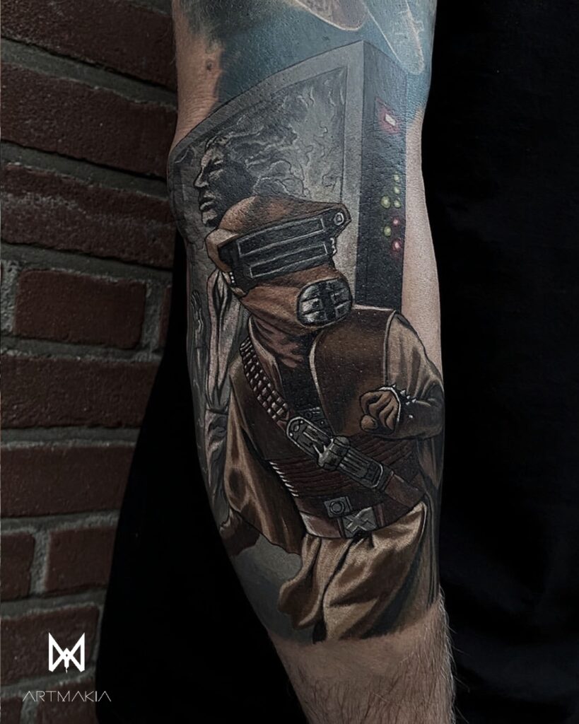 Realistische Star Wars tattoo van Boushh en Han Solo in carbonite op bovenarm.