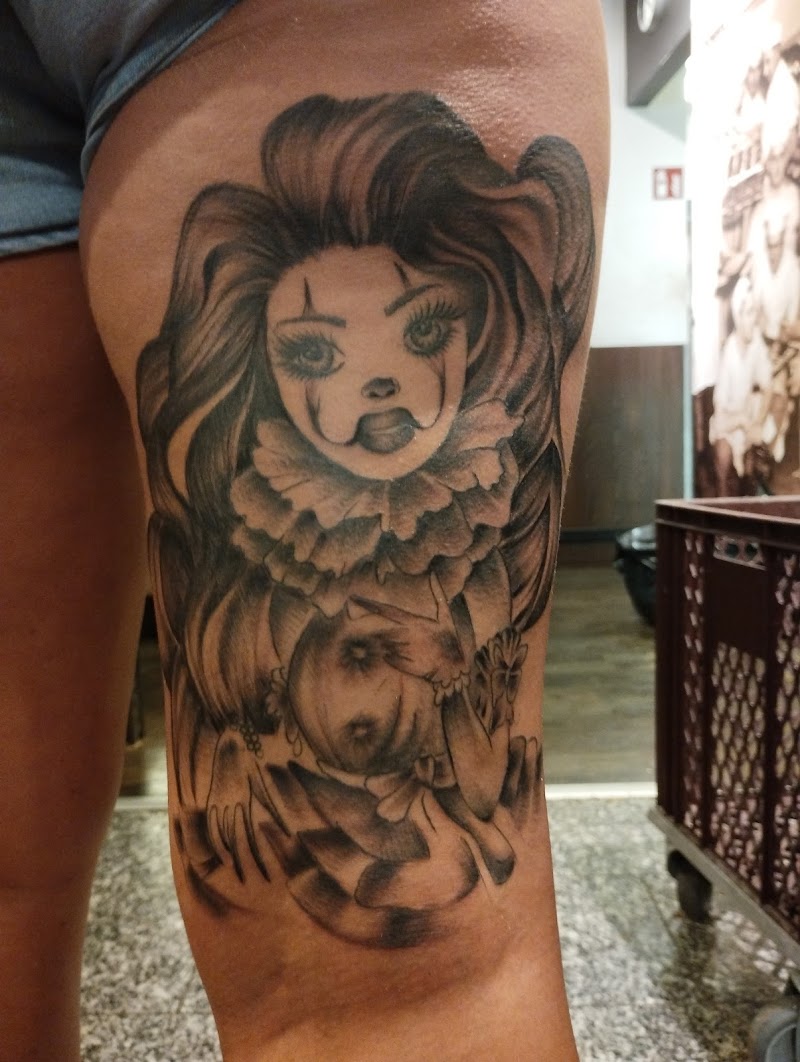 Zwart-wit Chicano tattoo van een vrouwelijke clown op het bovenbeen.