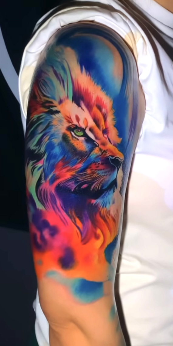 Kleurrijke aquarel leeuwenkop op bovenarm.