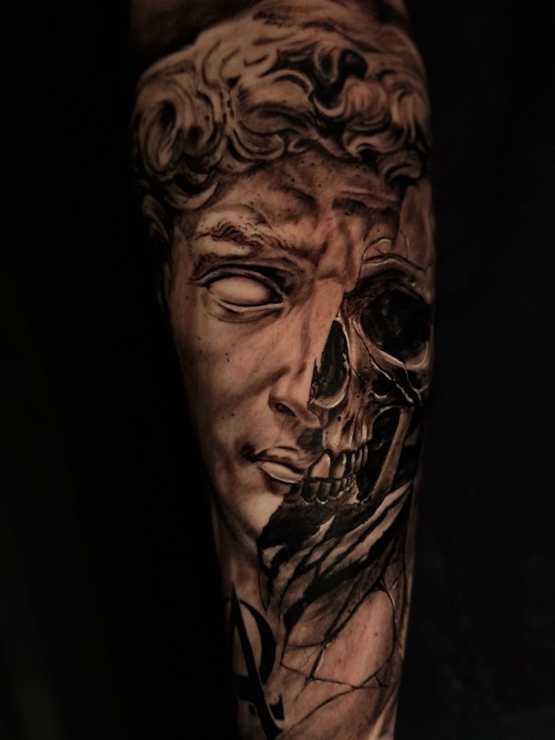 Realistische tattoo van een klassiek standbeeld dat half schedel is.