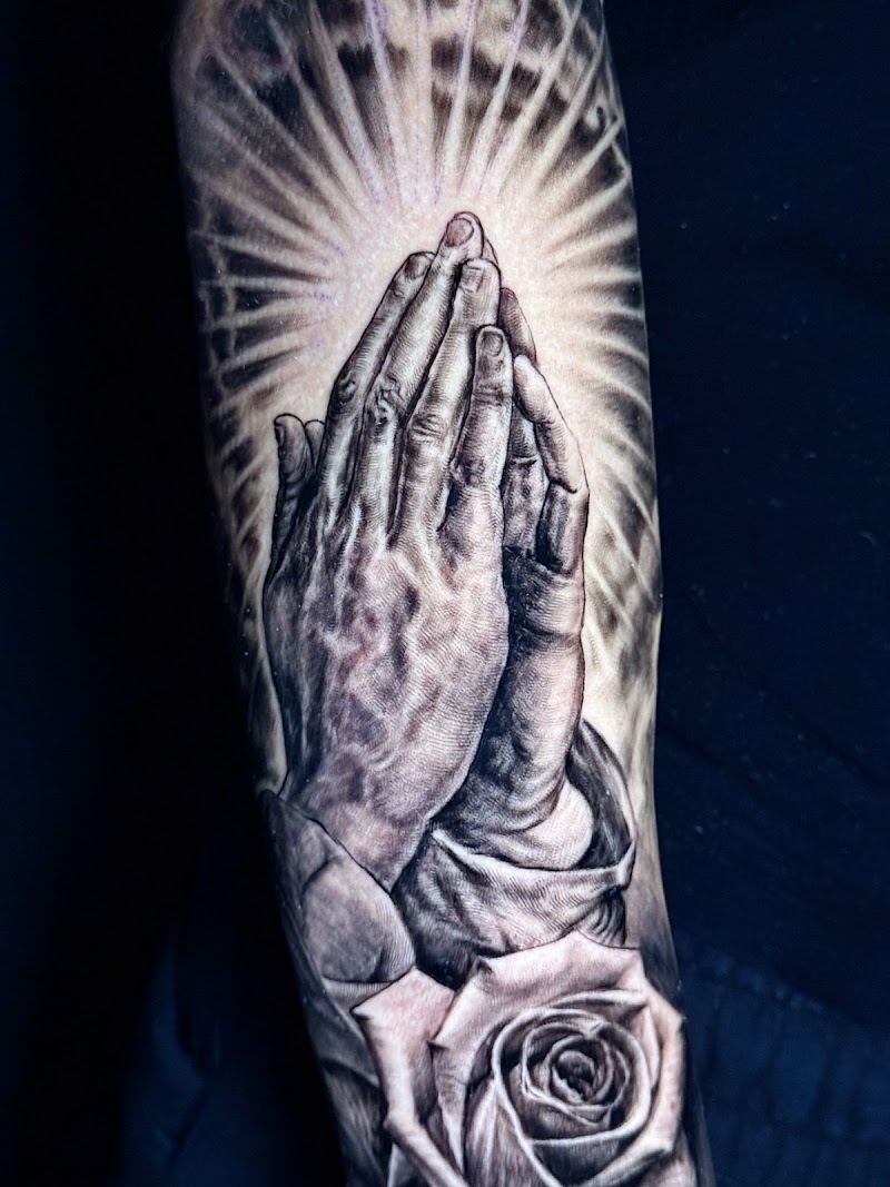 Realistische biddende handen met roos en stralen op de bovenarm.