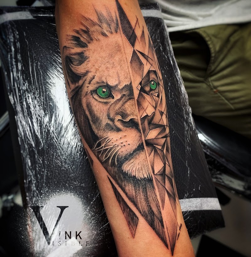 Half realistische, half geometrische leeuw met groene ogen op onderarm.