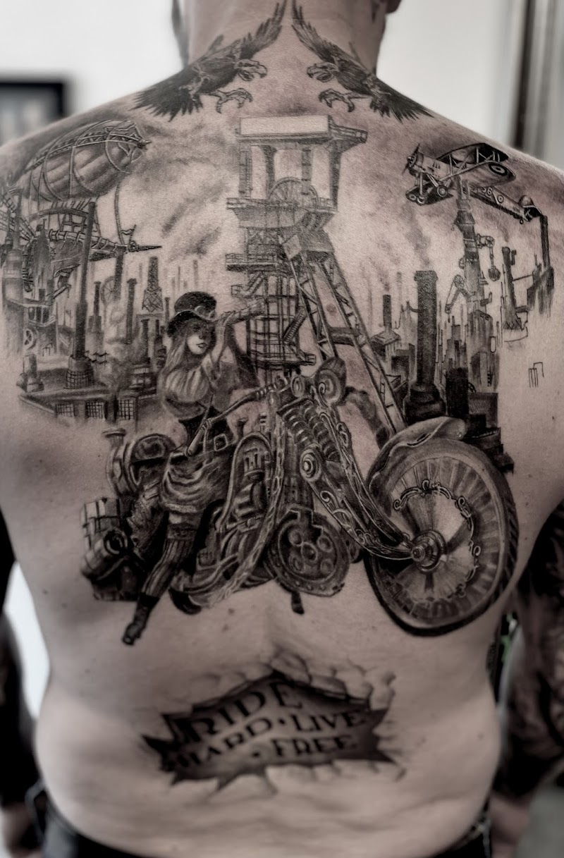 Grote steampunk rugtattoo met vrouw op motor en industriële achtergrond.