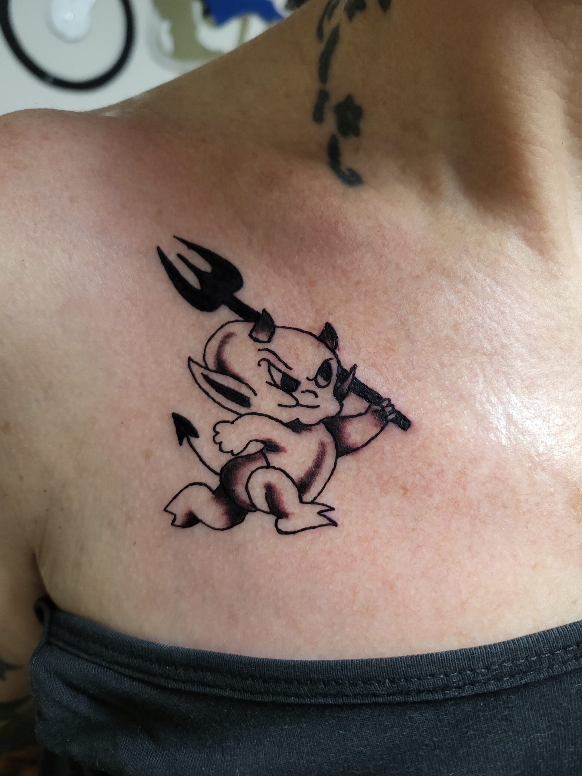 Kleine duivel met drietand op de borst.